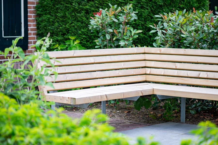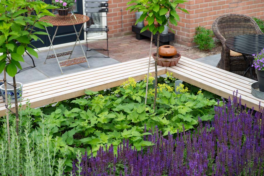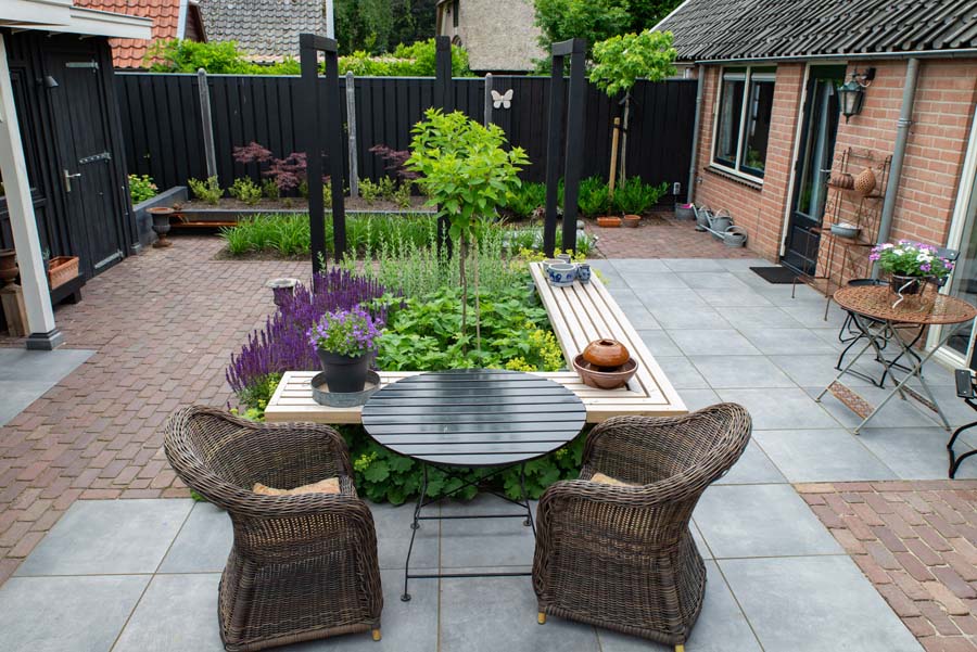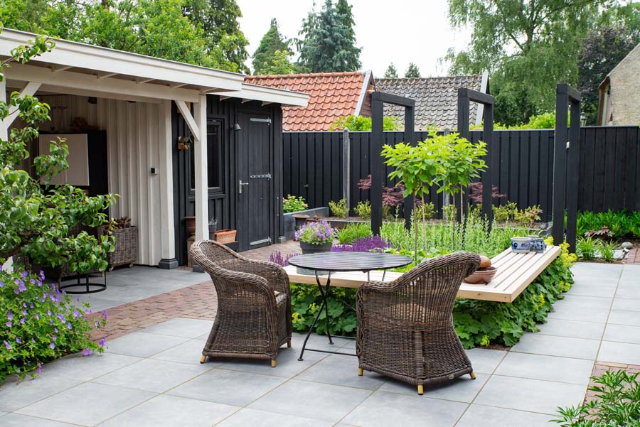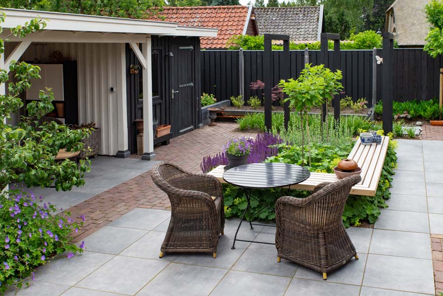 De tuineigenaren wilde echt genieten van hun tuin, samen genieten. Vandaar de diverse zitplaatsen, waaronder een overdekte, en een grote diversiteit in beplanting.