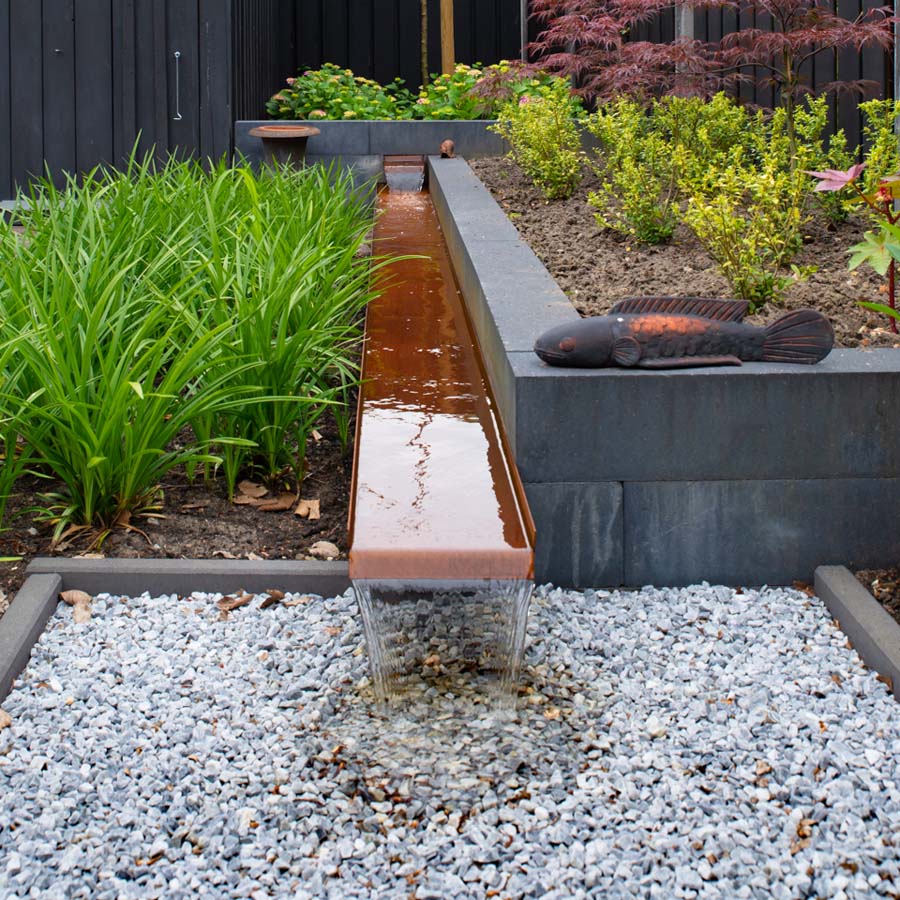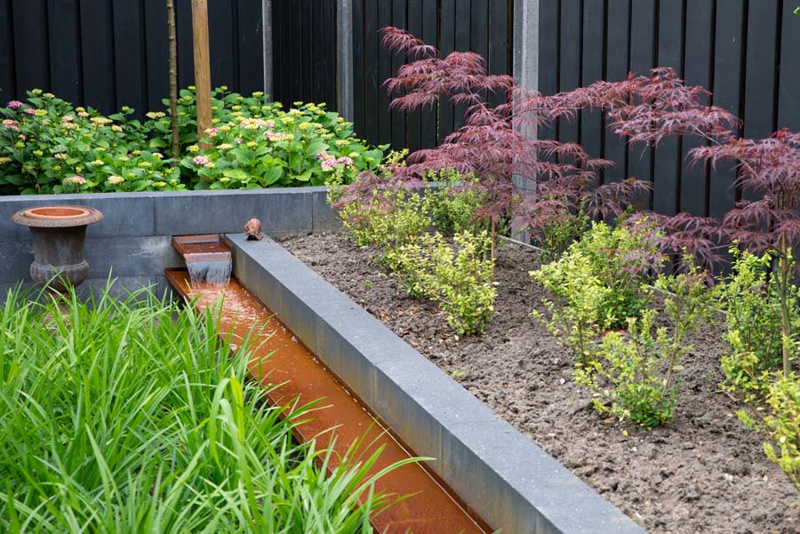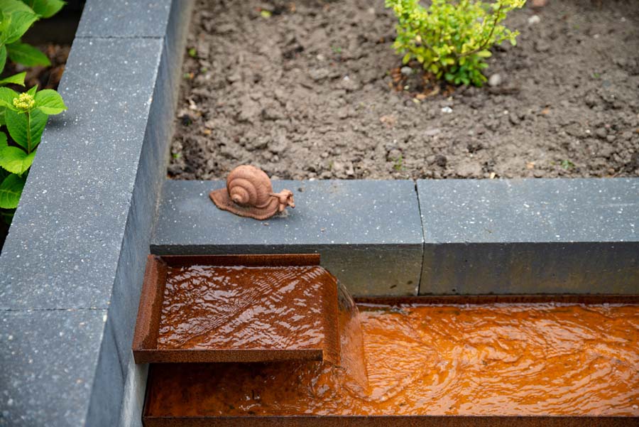 Het cortenstalen waterelement is een echte eyecatcher en zorgt voor fijne ontspanning.